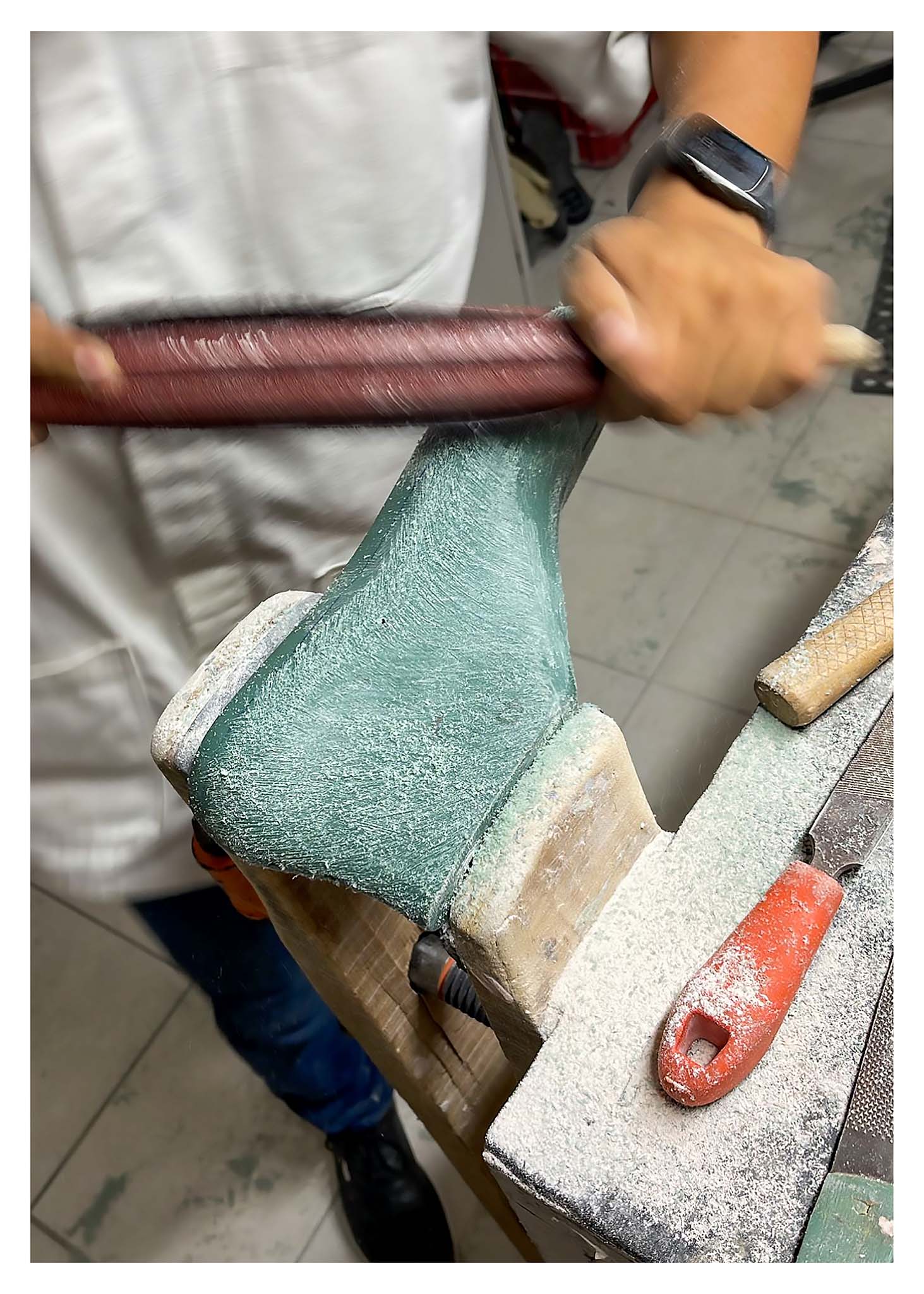 Our soles are crafted from pure virgin rubber, free of artificial additives, using a traditional vulcanization process. The complexity of the Escalons design makes our soles four times more challenging to produce than a regular shoe sole. In the final stage of fabrication, excess rubber is carefully removed by hand using a special tool called a mototool.