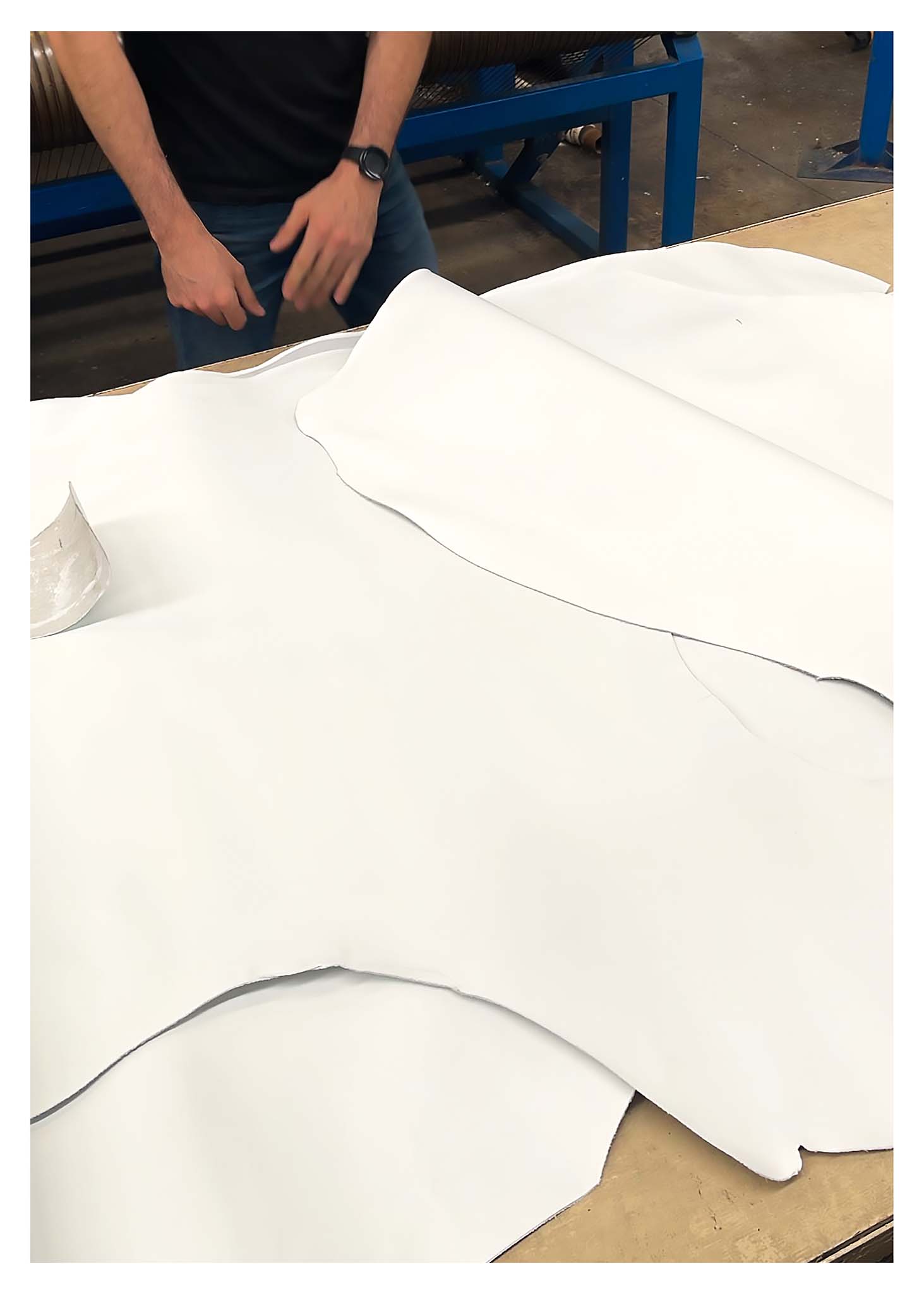 We selected full-grain leather, Bomba Blanca, for our model due to its superior quality, concept, and comfort.